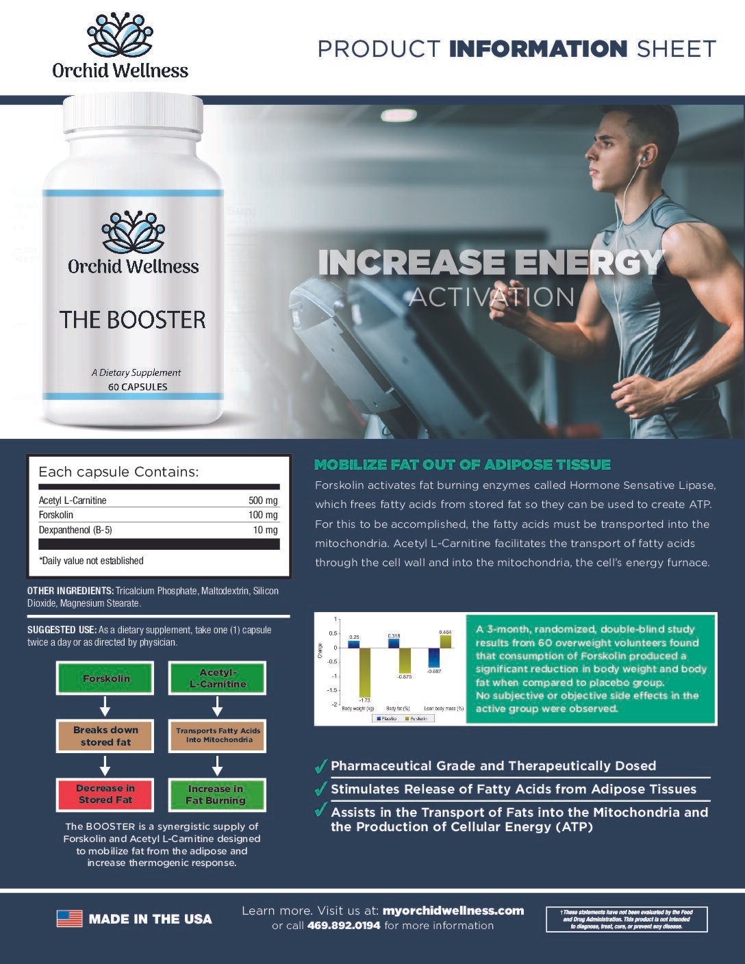 Forskolin activates fat-burning enzymes called Hormone Sensative Lipase, which frees fatty acids from stored fat so they can be used to create ATP. For this to be accomplished, the fatty acids must be transported into the mitochondria. Acetyl L-Carnitine facilitates the transport of fatty acids through the cell wall and into the mitochondria, the cell’s energy furnace. The result is an increase in energy activation and provides an energy boost.